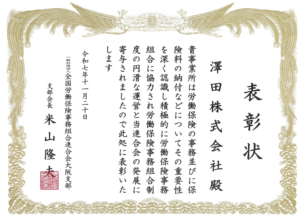 澤田株式会社(以下、当社)は、大阪労働局と一般財団法人全国労働保険事務組合連合会大阪支部が主催する『令和7年度 優良労働保険事務組合等表彰』において優良委託事業所として受賞いたしました。